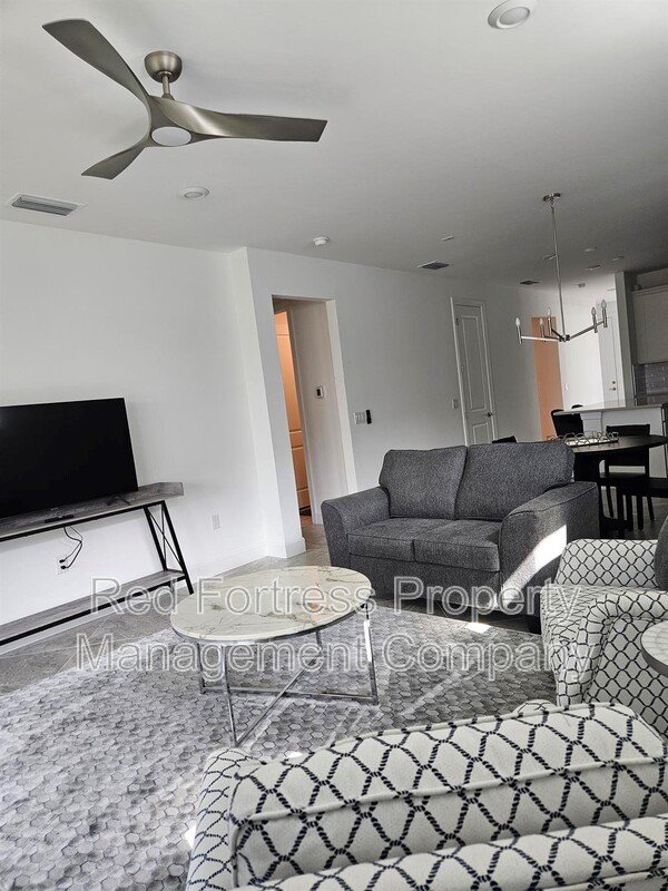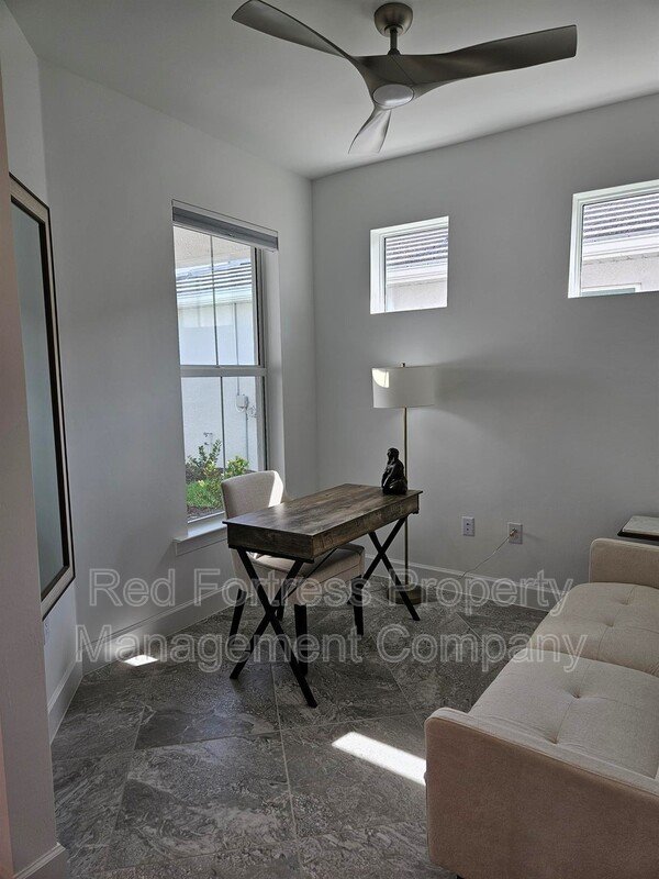 BRAND NEW HOME is MOVE IN READY with furnishings, features 2 bedrooms, 2 baths, flex room, and 2.5 car garage. Enjoy cooking with stainless steel natural gas appliances. This home has white wood cabinets, custom stylish backsplash, quartz countertops, 8’ doors, and 22x22 tile flooring throughout. Impact glass, garage floor epoxy finish, and includes a smart home package. Gathering room has a sliding glass door to a extended covered screened-in lanai with western landscaped views.